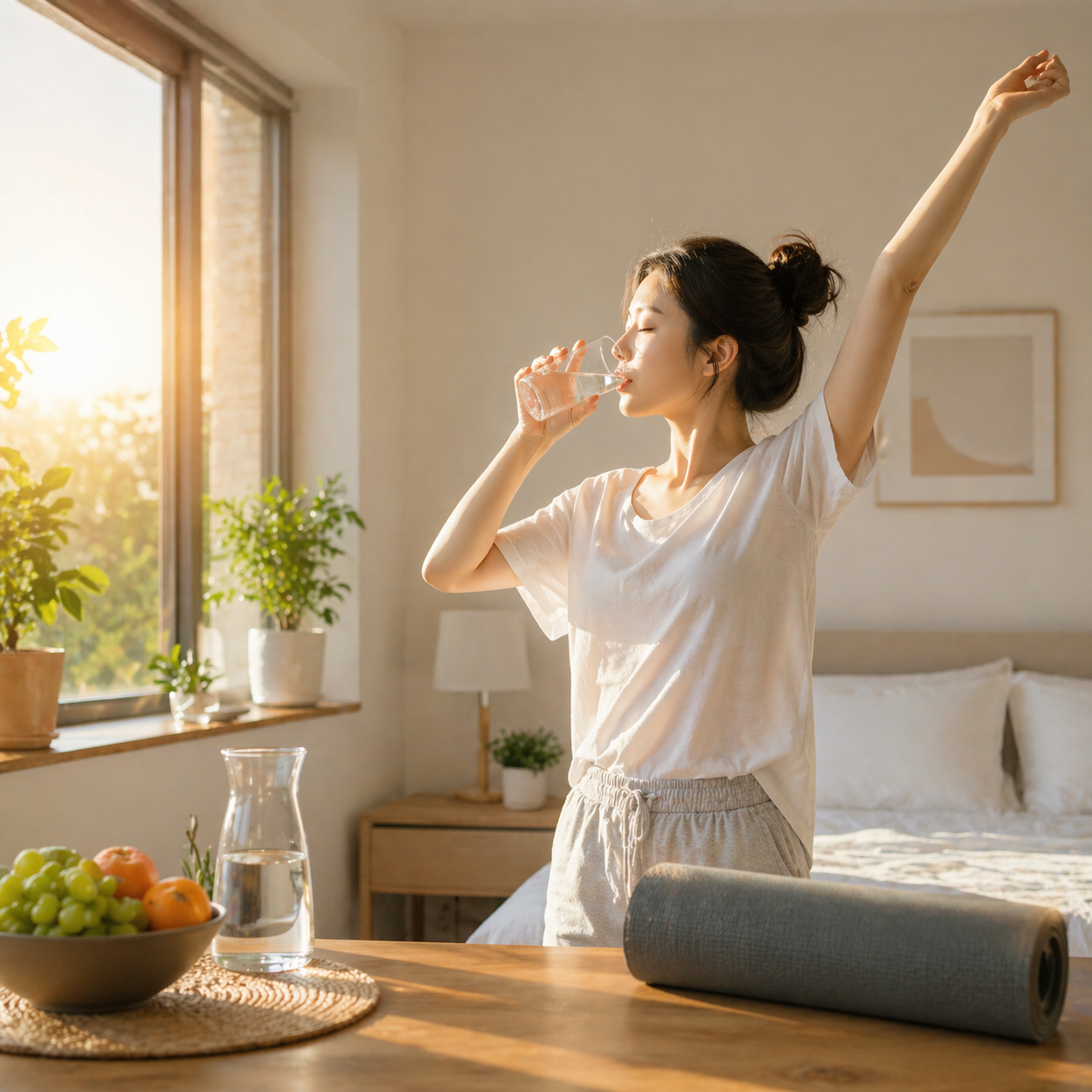 잠자는 동안 우리 몸은 수분이 부족해진 상태가 된다. 이때 물을 마시면 몸이 빠르게 깨어나고, 신진대사가 활성화되는 데 도움을 준다.